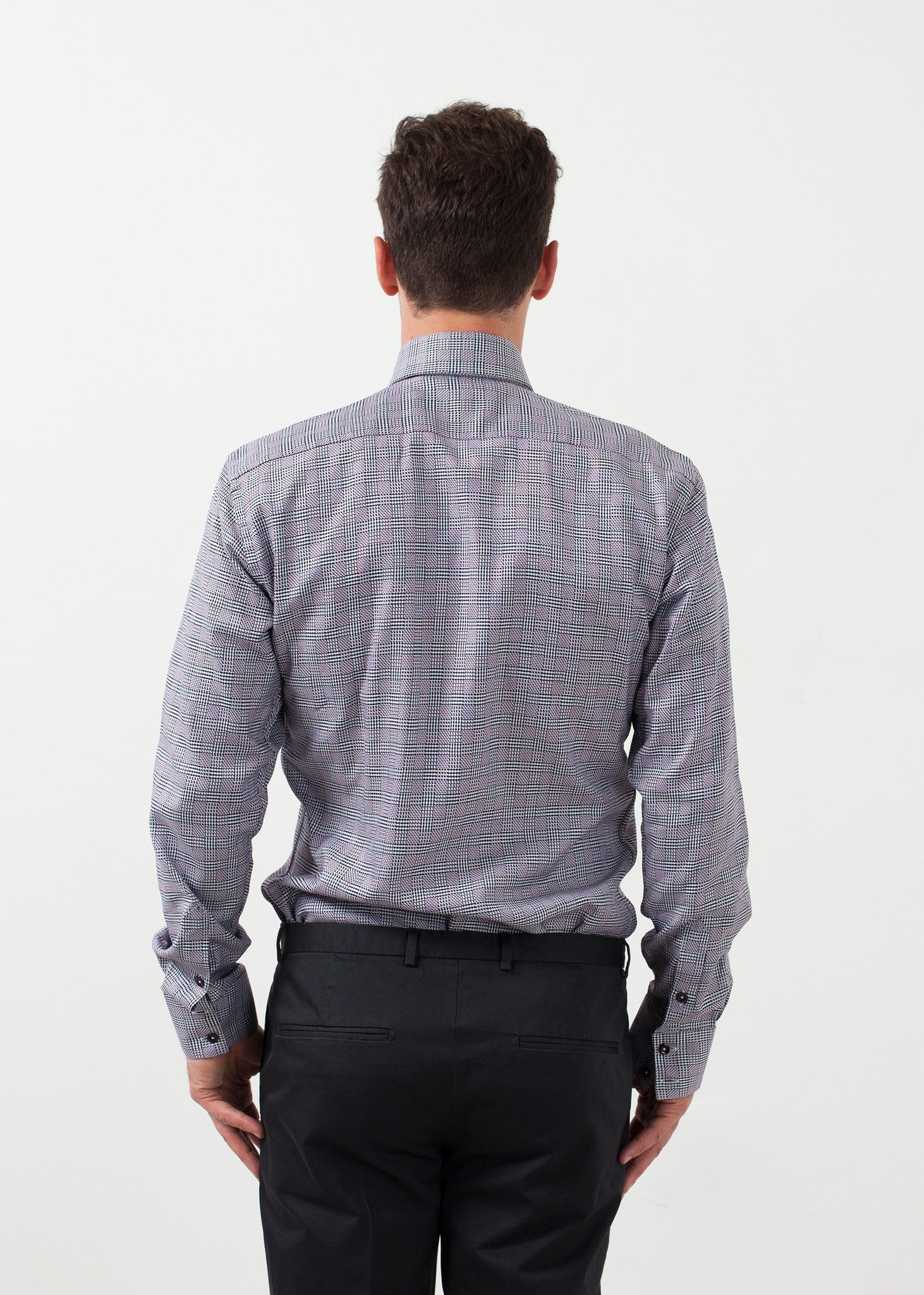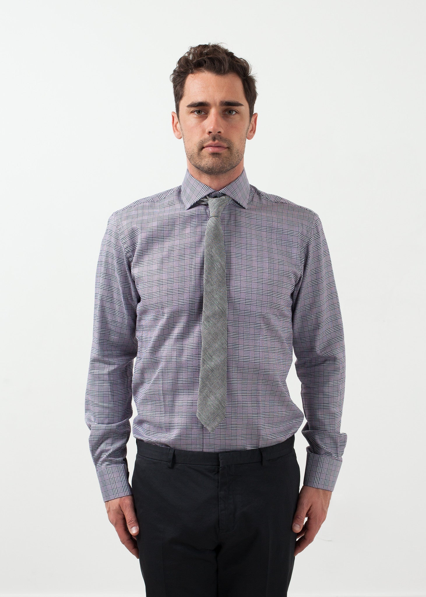 The Freeman acts as the standard Circle of Gentlemen shirt in excellence of tailoring. Button placket closure at front. Color Purple. 100% Cotton. Made in Turkey. Jacob is wearing a Size 39.
